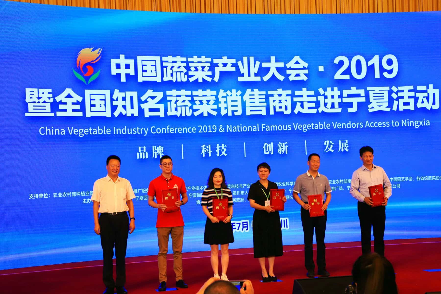 . 7月16日-19日,2019中国蔬菜产业大会暨全国知名蔬菜销售商走进宁夏活动在银川举办,农业农村部总畜牧师马有祥、自治区副主席王和山、中国农业大学原校长柯炳生、中国工程院院士张福锁及来自全国各省区市农业(蔬菜)主管部门负责人、全国蔬菜生产重点县农业主管部门负责人,蔬菜产业重点企业、合作社、批发市场、科研单位负责人等有关部门领导、农业企业、合作社代表等800余人参加会议。上海蔬菜食用菌行业协会会长、上海蔬菜集团董事长吴梦秋,上海市农业农村委蔬菜办副主任叶建平以及奉贤、浦东、金山、青浦、松江蔬菜技术推广部门和相关企业、合作社代表20余人参加此次产业大会。