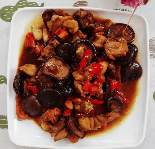 原料:鸡腿、香菇、盐、糖、味精、红椒、生姜、大蒜。