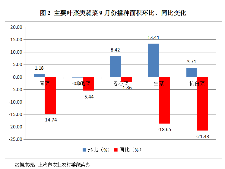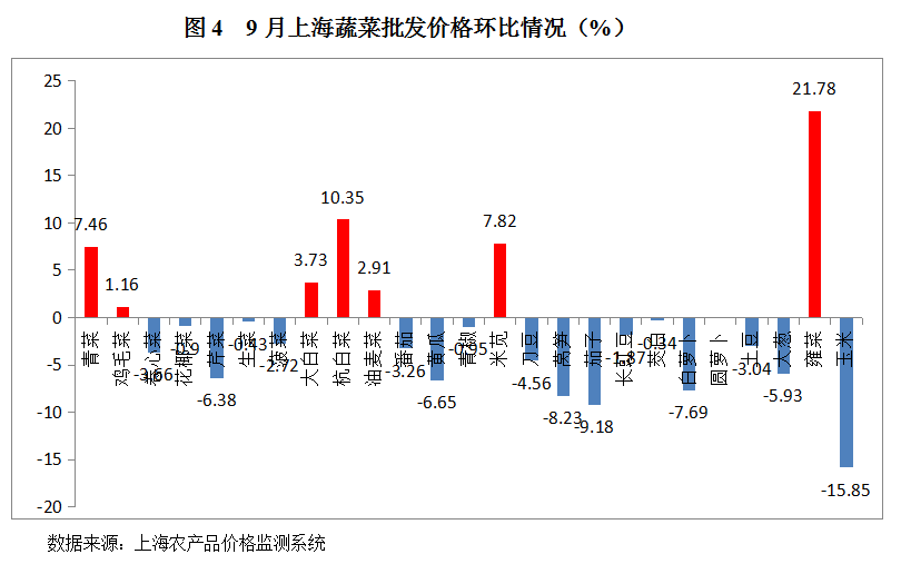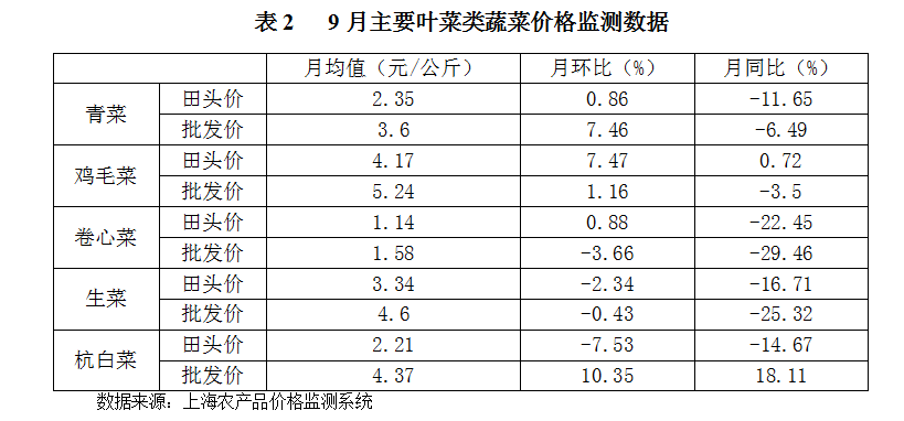 . 上海9月上旬降水量异常偏多,对蔬菜特别是露地蔬菜生产和生长十分不利,青菜、鸡毛菜等叶菜类蔬菜价格上涨较为明显;中下旬天气基本适宜在田蔬菜生长、管理,随着天气逐渐转好蔬菜价格也明显回落。9月份郊区蔬菜总上市量为196655吨,环比增加12.48%,同比减少11.17%。
