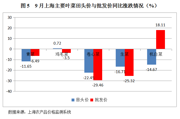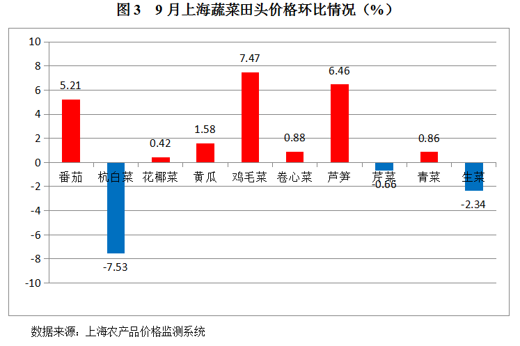 . 根据监测数据,9月份全市监测的11种蔬菜田头价,有7种蔬菜田头价环比上涨,涨幅最大的为鸡毛菜,上涨7.47%;有3种蔬菜田头价环比下跌,跌幅最大的为杭白菜,下跌7.53%。另外,因为茭白8月份没有监测数据,所以环比情况无。整体来看,9月份蔬菜田头价格环比变化较小,上涨下跌幅度都没有超过10%。文章源自:上海蔬菜食用菌行业协会 Shanghai Vegetable & Edible Fungi Industry Associatio上海蔬菜食用菌行业协会-https://www.shsjx.org.cn/11061.html