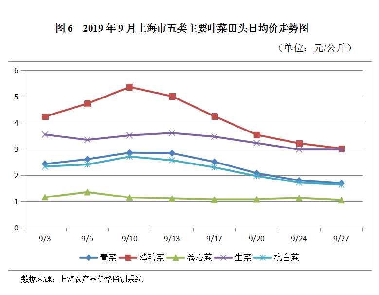 . 纵观五种主要叶菜9月份田头价格,其价格走势情况大体一致:月初价格处于上涨趋势,9月10日前后涨至最高价,之后到月底价格一路逐渐下跌。除鸡毛菜之外,其他四种蔬菜整月的价格变化起伏不大。鸡毛菜全月最高价相比全月最低价,相差比率为77.5%。