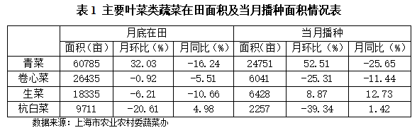 . 本月底上海市郊区蔬菜在田面积为383124亩,环比增加0.45%,同比减少7.11%。在田面积前五的蔬菜依次为:花菜(75748亩)、青菜(60785亩)、卷心菜(26435亩)、生菜(18335亩)、茭白(15451亩)。四类主要叶菜(青菜、卷心菜、生菜、杭白菜,下同)月底在田面积环比情况,除了青菜增加32.03%之外,其他三种蔬菜环比在田面积均为减少,减幅最大的是杭白菜,减少20.61%;同比情况,除了杭白菜在田面积同比增加4.98%之外,另外三类蔬菜在田面积均有所减少,减幅最大的是青菜,减少16.24%。文章源自:上海蔬菜食用菌行业协会 Shanghai Vegetable & Edible Fungi Industry Associatio上海蔬菜食用菌行业协会-https://www.shsjx.org.cn/11573.html