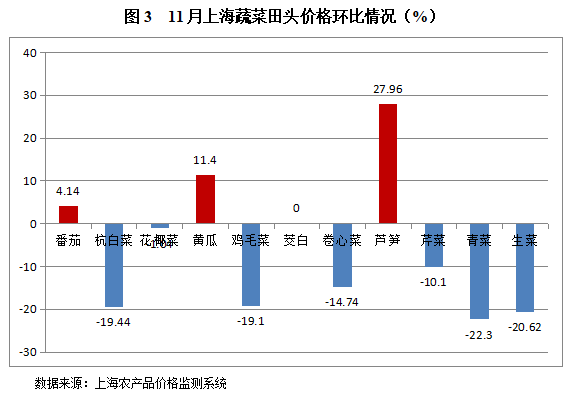 . 根据监测数据,11月份全市监测的11种蔬菜田头价,只有番茄、黄瓜和芦笋3种蔬菜田头价环比上涨,涨幅最大的为芦笋,上涨27.96%;茭白田头价环比持平;另外7种蔬菜田头价环比下跌,跌幅最大的为青菜,下跌22.3%。