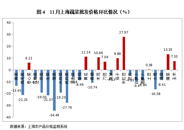 . 根据11月份全市5大批发市场监测的26种蔬菜批发价格数据,有17种蔬菜批发价格环比下跌,跌幅最大的为菠菜,环比下跌34.49%,有9种蔬菜批发价格环比上涨,涨幅最大的为长豇豆,环比上涨27.97%。