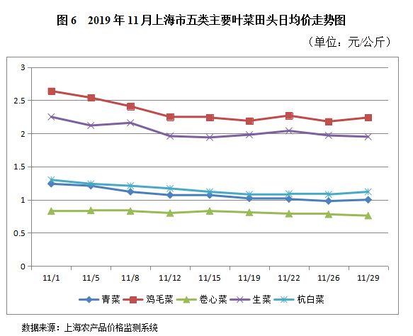 . 纵观五种主要叶菜11月份田头价格,其价格走势十分平稳,波动很小,整体为微降趋势。整个11月份,同一种品类的蔬菜其全月日均最高价与全月日均最低价格之间相差不到0.5元。