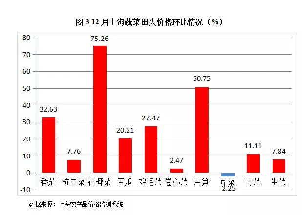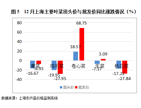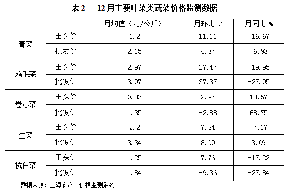 . 根据上海市农产品价格监测系统的数据采集及汇总情况来看:上海市12月蔬菜月均田头价2.1元/公斤,环比上涨13.51%、同比持平;蔬菜月均批发价3.81元/公斤,环比上涨12.72%、同比上涨14.76%。主要的五类叶菜田头价与批发价监测数据对照情况如下:文章源自:上海蔬菜食用菌行业协会 Shanghai Vegetable & Edible Fungi Industry Associatio上海蔬菜食用菌行业协会-https://www.shsjx.org.cn/11842.html