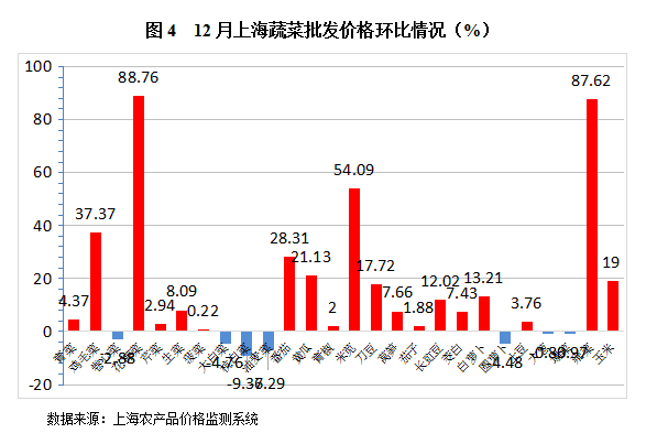 . 根据12月份全市5大批发市场监测的26种蔬菜批发价格数据,有7种蔬菜批发价格环比下跌,跌幅最大的为杭白菜,环比下跌9.37%,有19种蔬菜批发价格环比上涨,涨幅最大的为花椰菜,环比上涨88.76%。