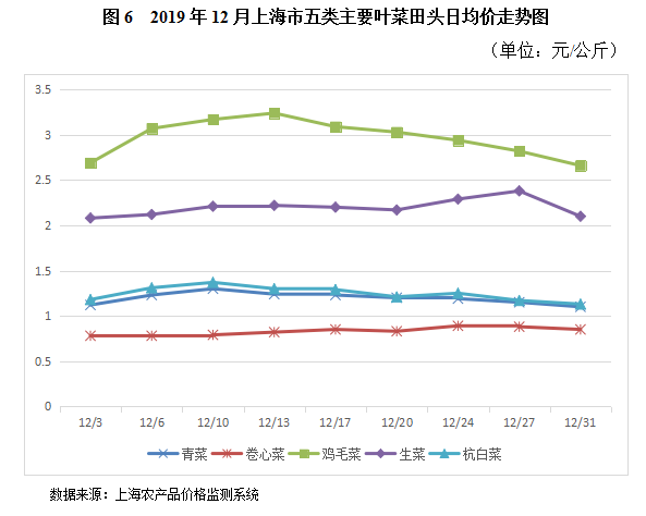 . 纵观五种主要叶菜12月份田头价格,青菜、卷心菜、杭白菜这3种叶菜的价格走势十分平稳,波动很小,整体为微降趋势;鸡毛菜、生菜这2种叶菜略有波动,整体为先升后降。整个12月份,同一种品类的蔬菜其全月日均最高价与全月日均最低价格之间相差0.55元。