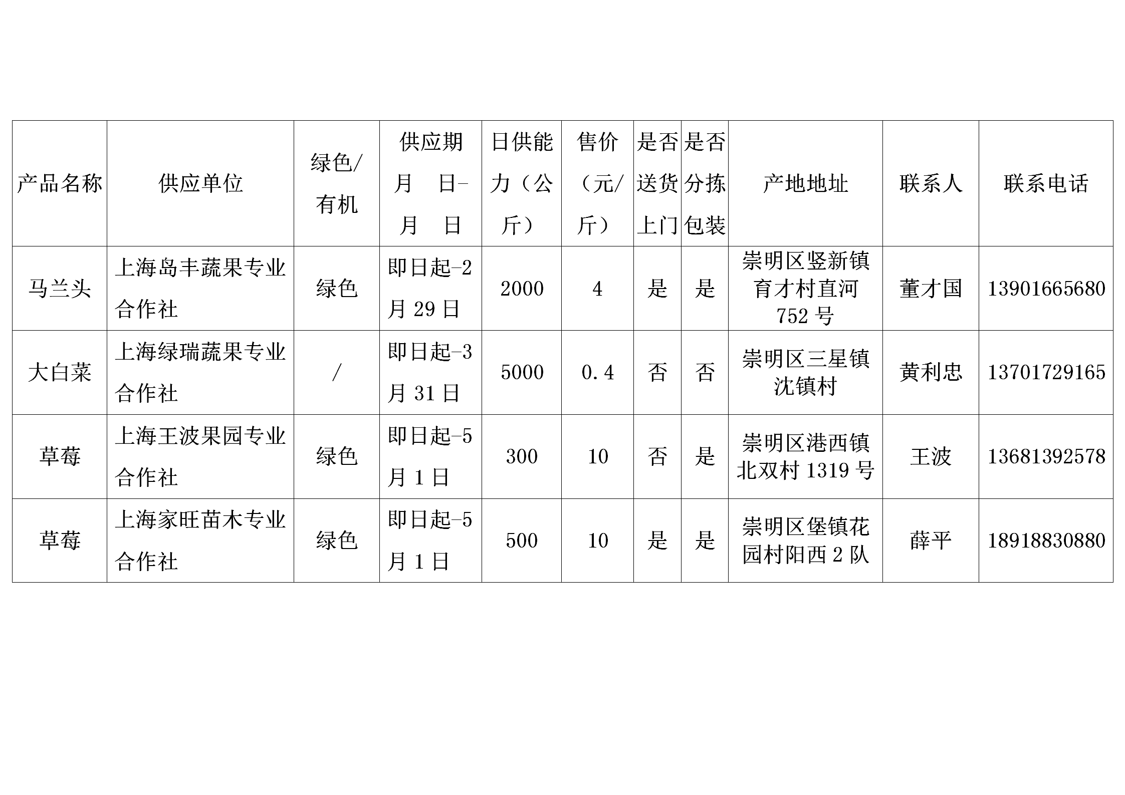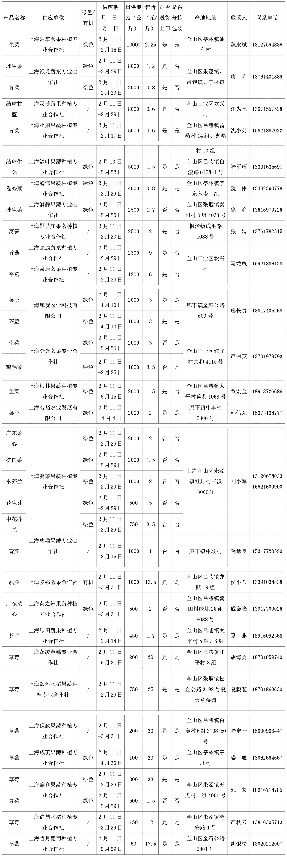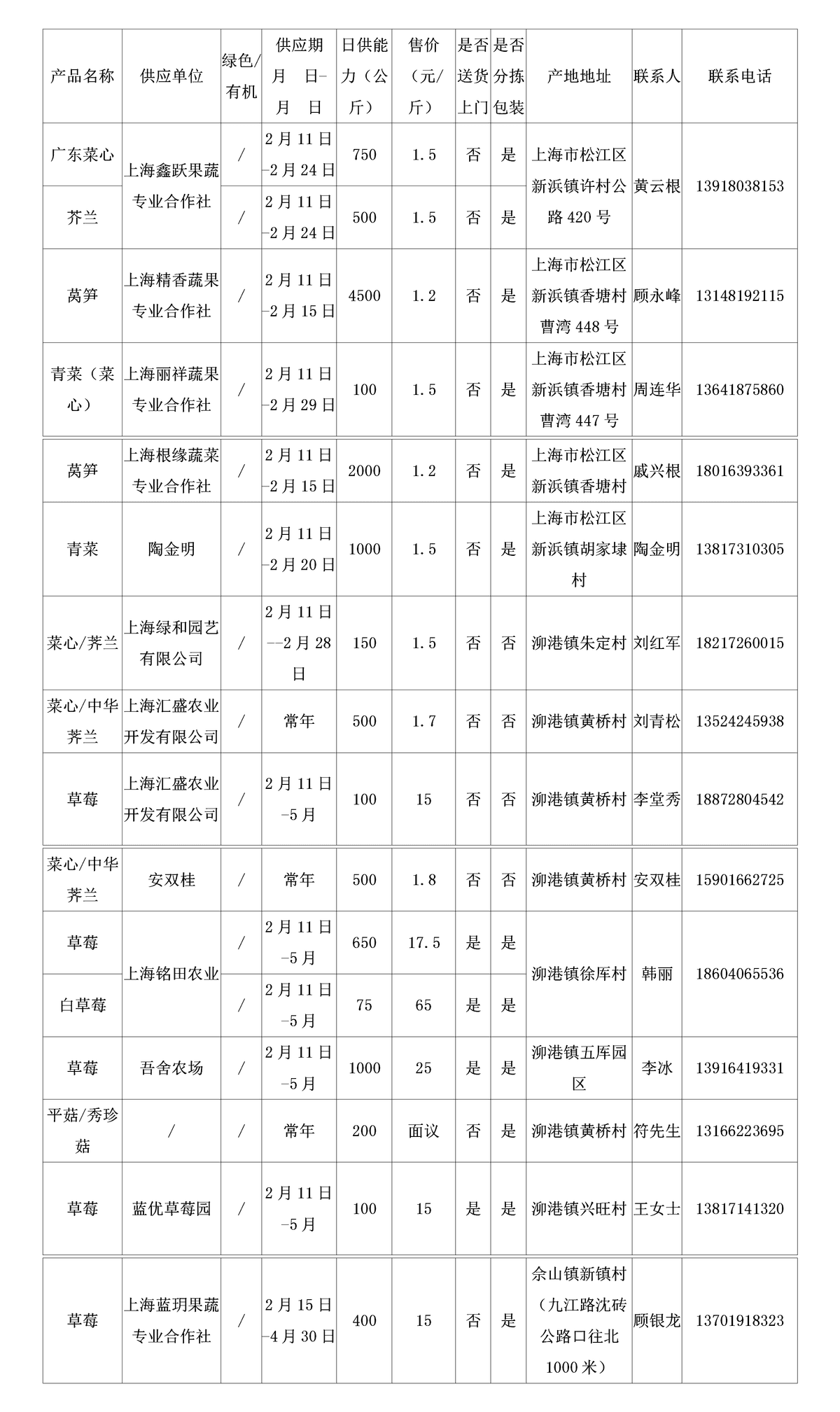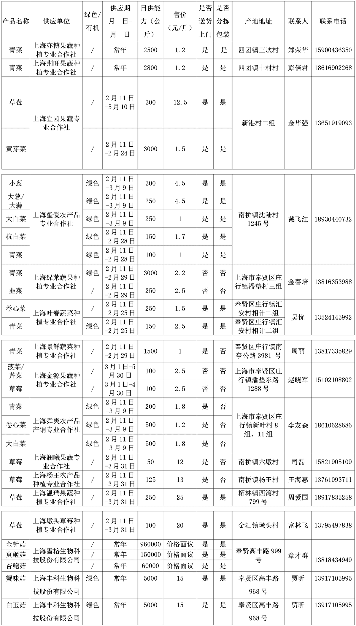 上海市地产蔬菜(含草莓、食用菌)供应信息表