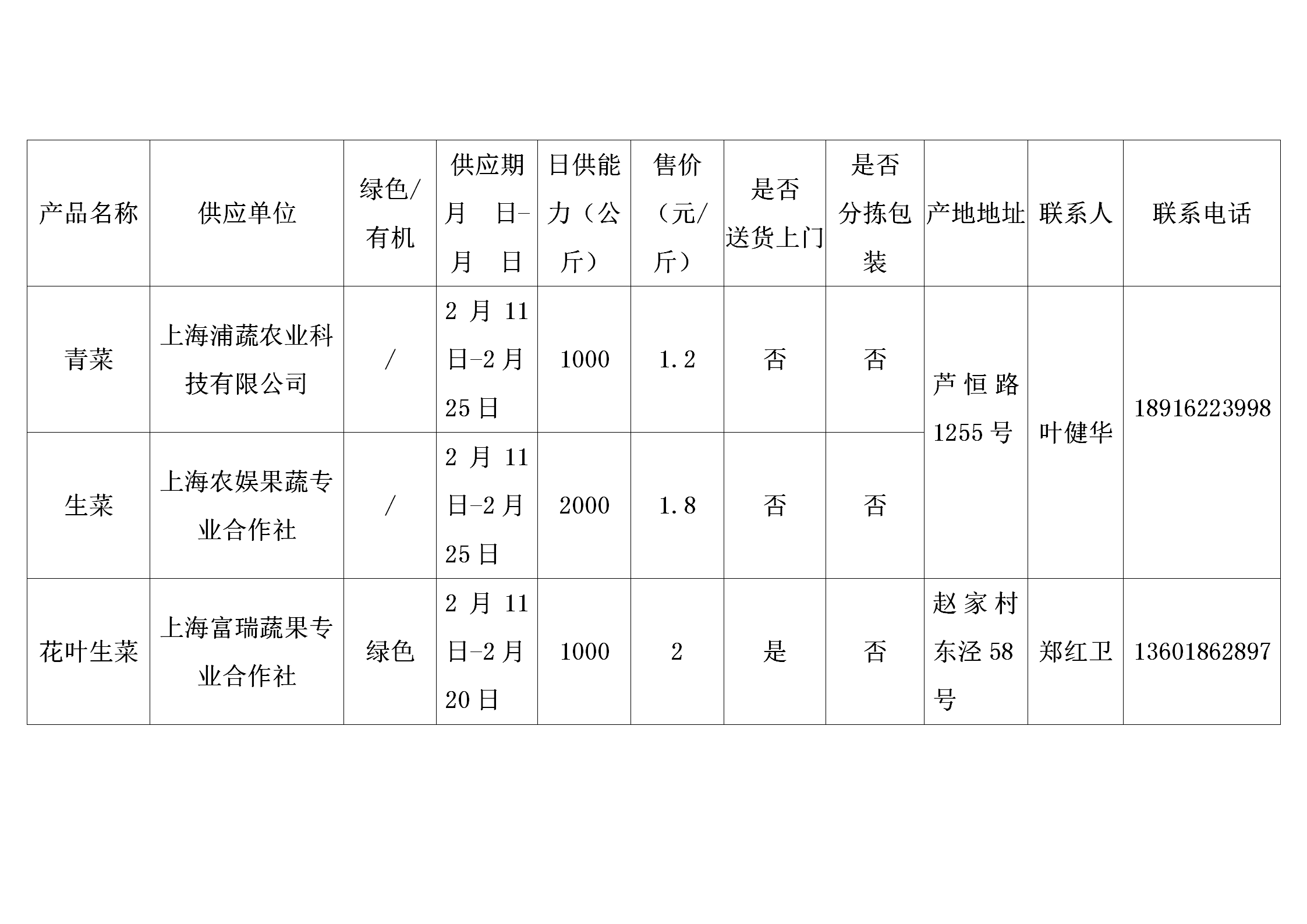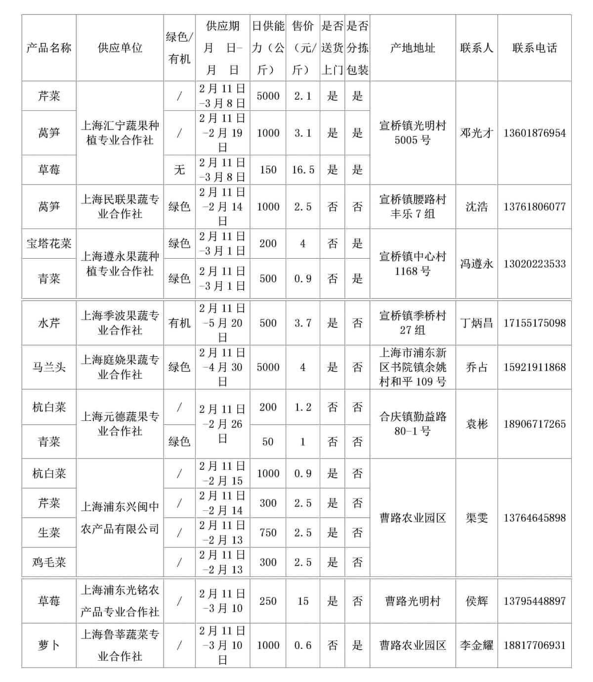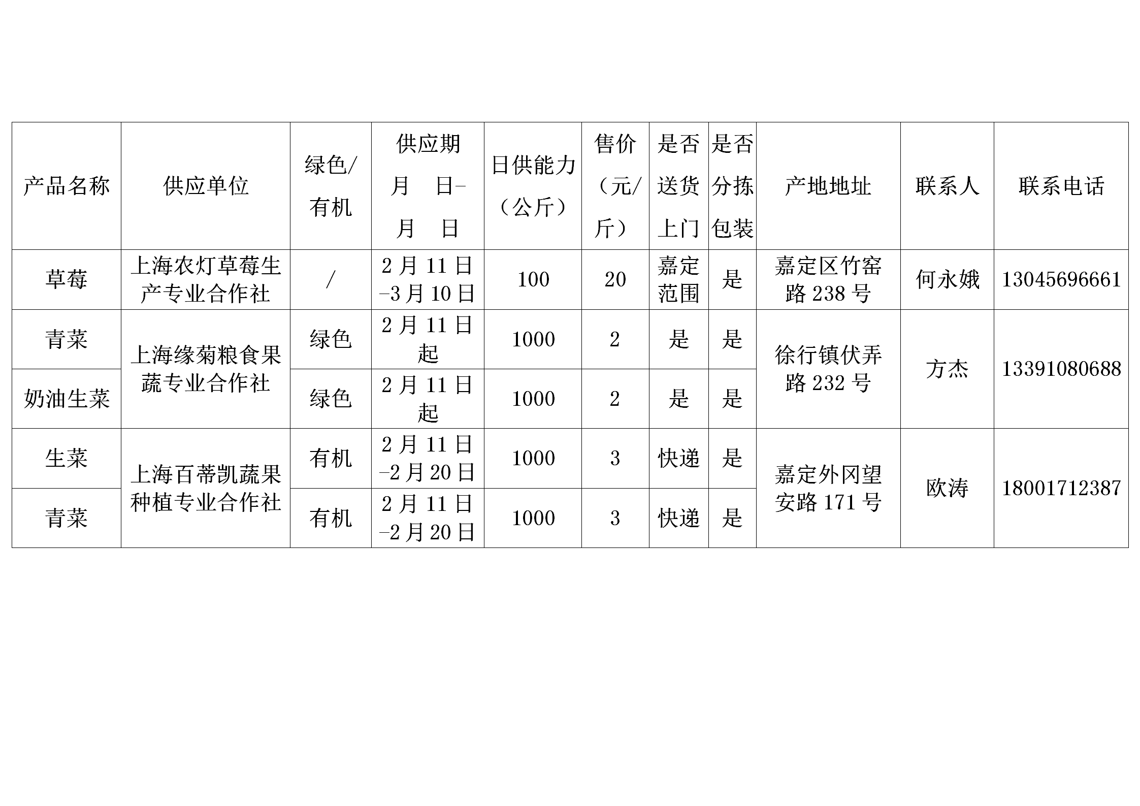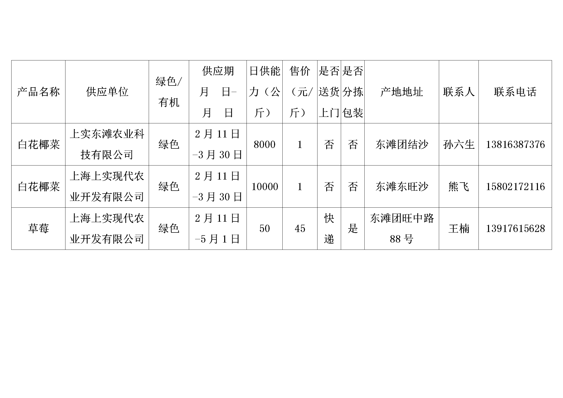 上海市地产蔬菜(含草莓、食用菌)供应信息表