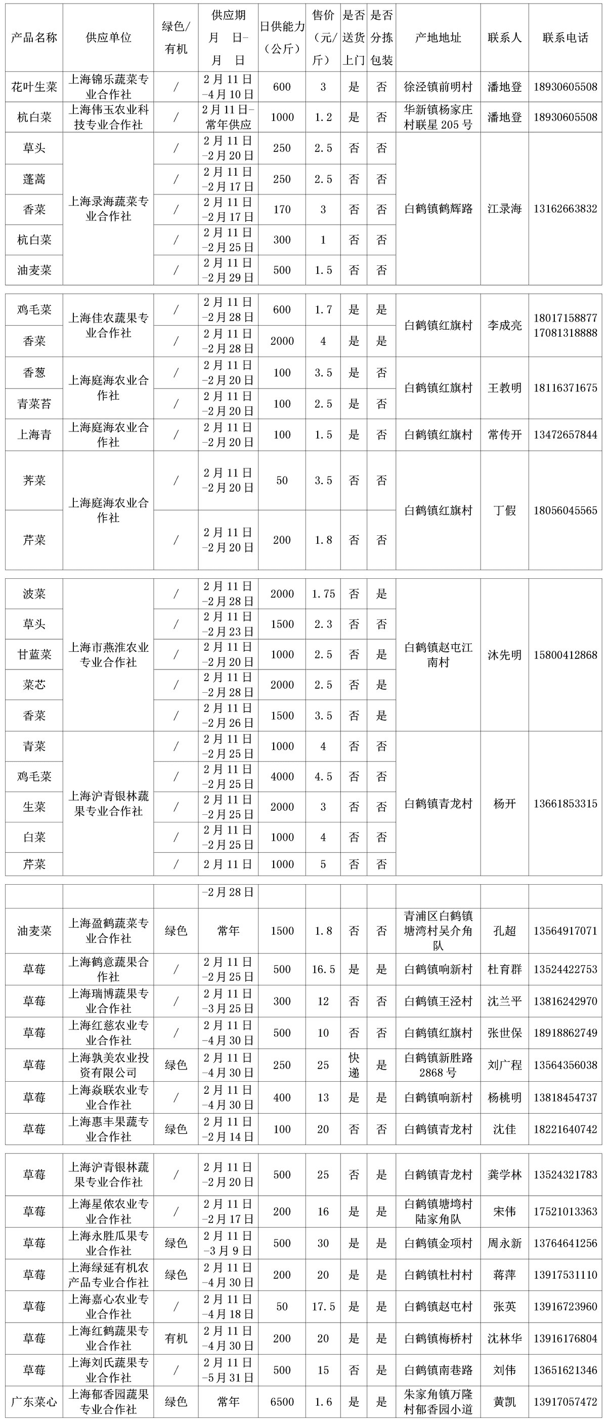 . 为促进本市地产蔬菜(含草莓、食用菌)产销对接,切实帮助蔬菜基地、合作社解决因疫情防控而出现的“卖菜难”问题,市民“买菜贵”的现象,在上海市农业农村委蔬菜办以及各区农业部门的支持下,我行业协会自2020年2月10日起,分批定期集中发布疫情防控期间上海市地产蔬菜(含草莓、食用菌)供应信息表,同时也将在上海地产优质蔬菜线上线下融合对接平台(http://mall.guoxn.com/)同期发布,欢迎采购。文章源自:上海蔬菜食用菌行业协会 Shanghai Vegetable & Edible Fungi Industry Associatio上海蔬菜食用菌行业协会-https://www.shsjx.org.cn/11989.html