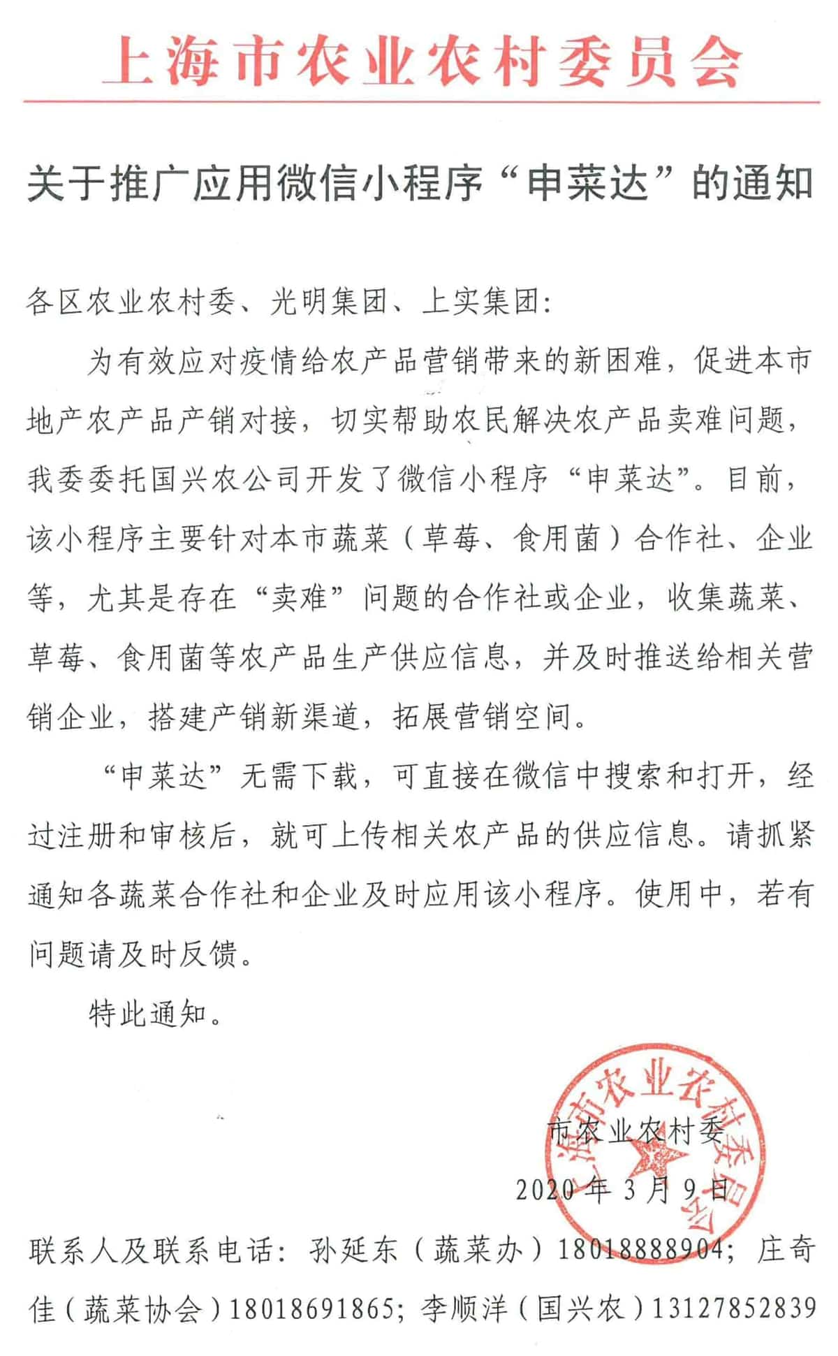 . “申菜达”是在上海市农业农村委蔬菜办以及各区农业部门的支持下创建的,是为了促进本市地产蔬菜(含草莓、食用菌)产销对接,切实帮助蔬菜基地、合作社解决因疫情防控而出现的“卖菜难”问题,市民“买菜贵”的现象。文章源自:上海蔬菜食用菌行业协会 Shanghai Vegetable & Edible Fungi Industry Associatio上海蔬菜食用菌行业协会-https://www.shsjx.org.cn/12334.html
