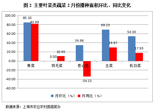 . 上海市2月平均气温偏高,尤其是下旬大部区域偏高5.0℃以上;降水量正常;日照时数偏多。本月总体天气条件较适宜蔬菜生长及管理,但中旬有一次寒潮天气过程,气温明显下降并伴有大风和降水,对蔬菜生长及管理有所影响。2月份郊区蔬菜总上市量为144000吨,环比减少14.37%,同比减少21.65%。