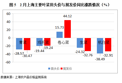 . 根据上海市农产品价格监测系统的数据采集及汇总情况来看:上海市2月蔬菜月均田头价2.43元/公斤,环比上涨6.58%、同比下降11.64%;蔬菜月均批发价4.39元/公斤,环比上涨8.66%、同比下降4.36%。主要的五类叶菜田头价与批发价监测数据对照情况如下:文章源自:上海蔬菜食用菌行业协会 Shanghai Vegetable & Edible Fungi Industry Associatio上海蔬菜食用菌行业协会-https://www.shsjx.org.cn/12346.html