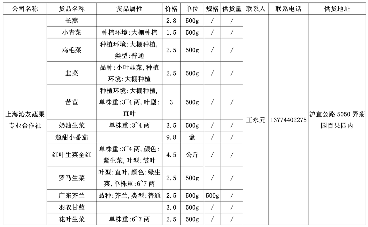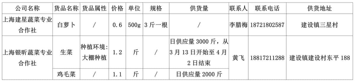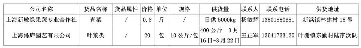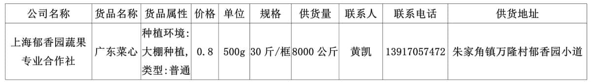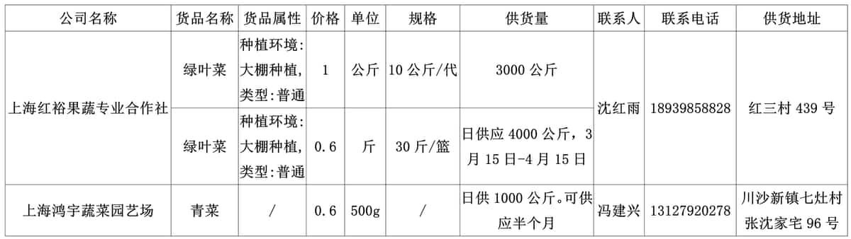 . 我协会根据绿色蔬菜供应信息收集小程序“申菜达”上企业自行申报的材料,收集整理了3月13日—3月19日本市蔬菜品种、规格、供货量及联系方式等信息,现集中发布。同时也将在上海地产优质蔬菜线上线下融合对接平台http://mall.guoxn.com/发布相关信息,欢迎采购。以下的价格单位为元,其他具体情况请买卖双方自行洽谈。文章源自:上海蔬菜食用菌行业协会 Shanghai Vegetable & Edible Fungi Industry Associatio上海蔬菜食用菌行业协会-https://www.shsjx.org.cn/12453.html