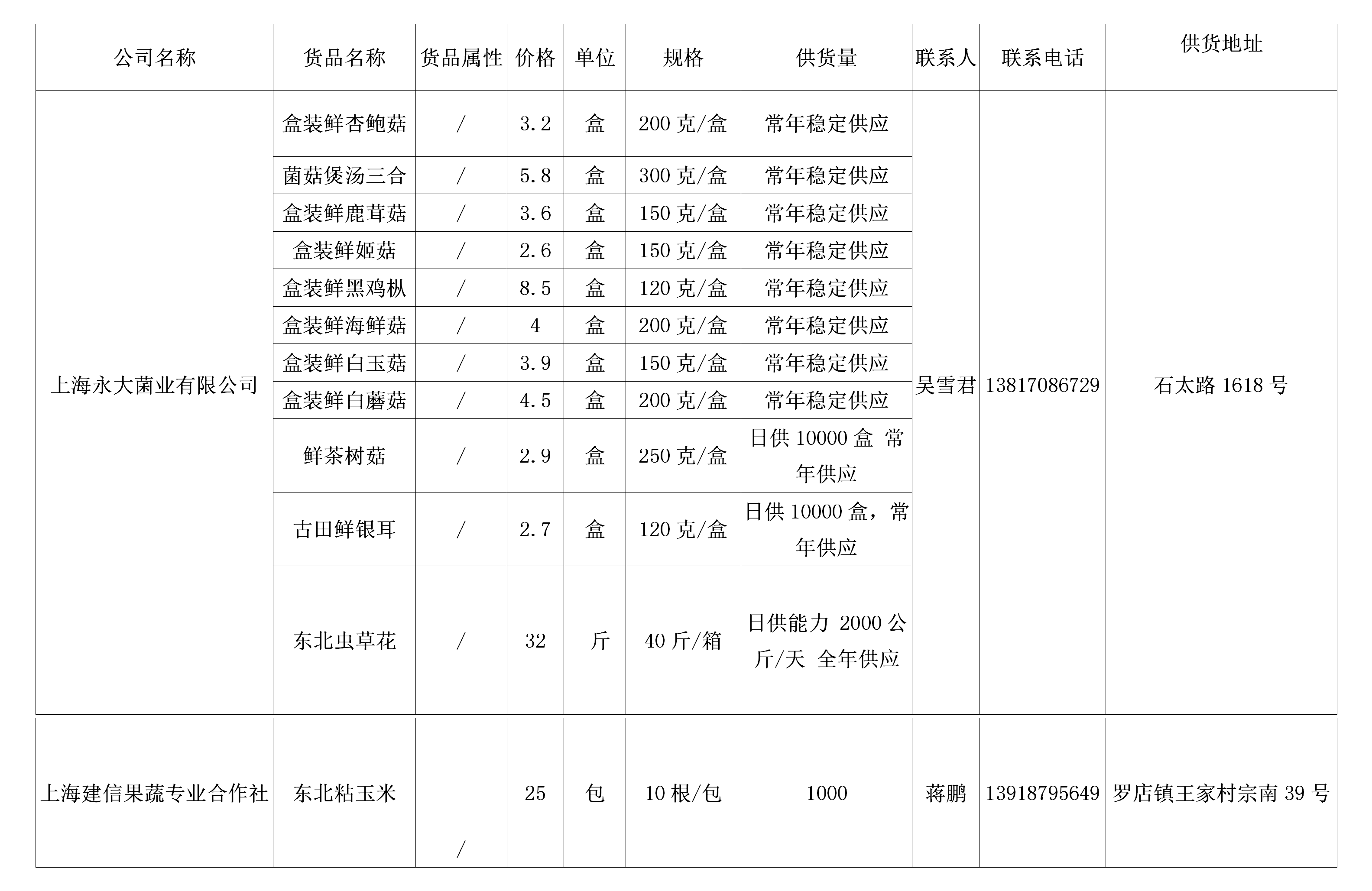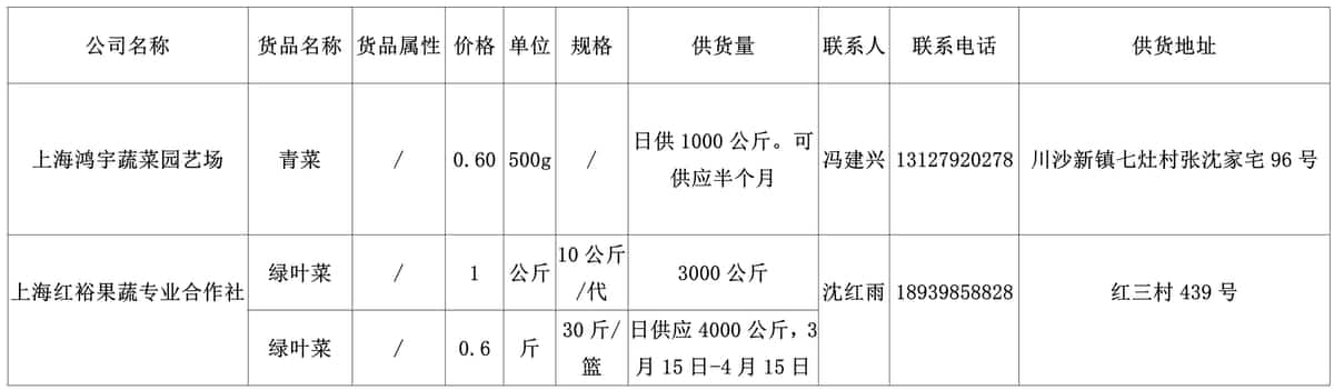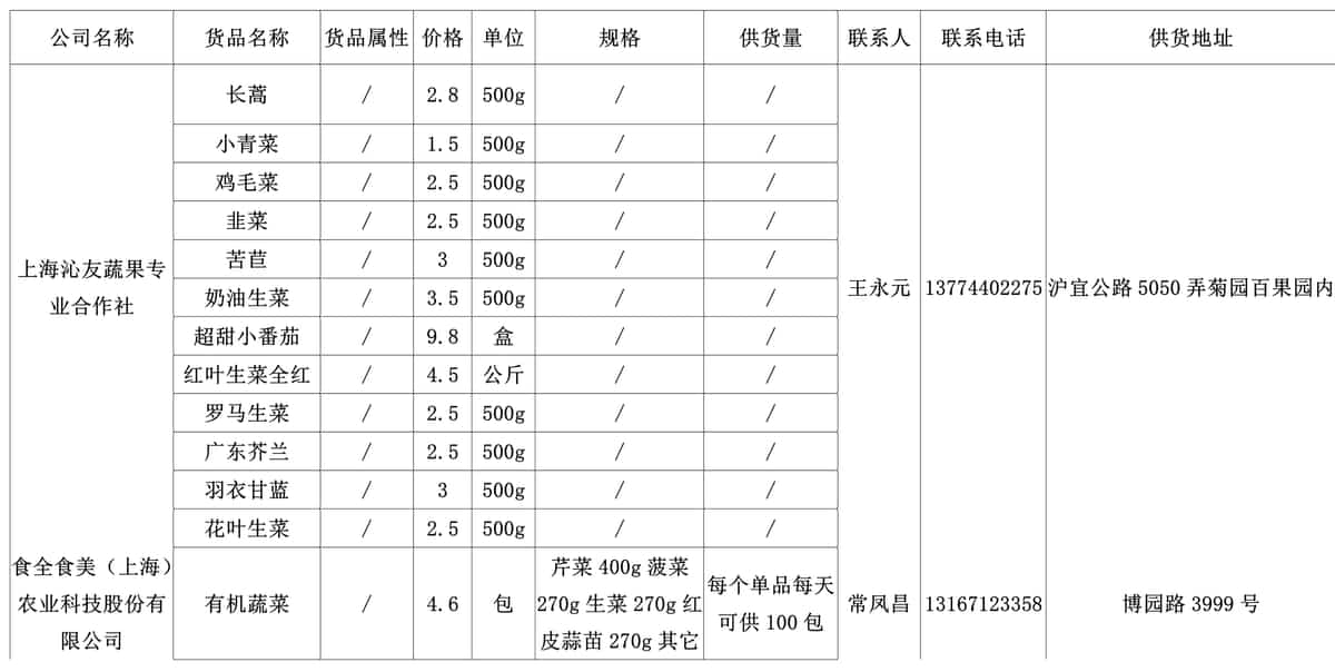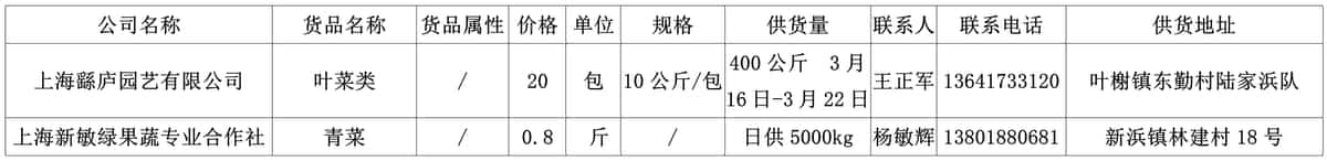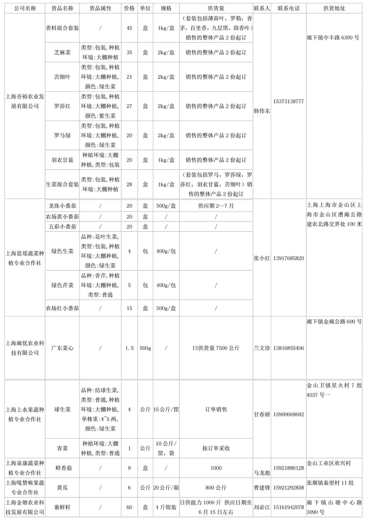 . 我协会根据绿色蔬菜供应信息收集小程序“申菜达”上企业自行申报的材料,收集整理了3月份以来本市蔬菜品种、规格、供货量及联系方式等信息,现集中发布。同时也将在上海地产优质蔬菜线上线下融合对接平台http://mall.guoxn.com/发布相关信息,欢迎采购。以下的价格单位为元,其他具体情况请买卖双方自行洽谈。文章源自:上海蔬菜食用菌行业协会 Shanghai Vegetable & Edible Fungi Industry Associatio上海蔬菜食用菌行业协会-https://www.shsjx.org.cn/12523.html