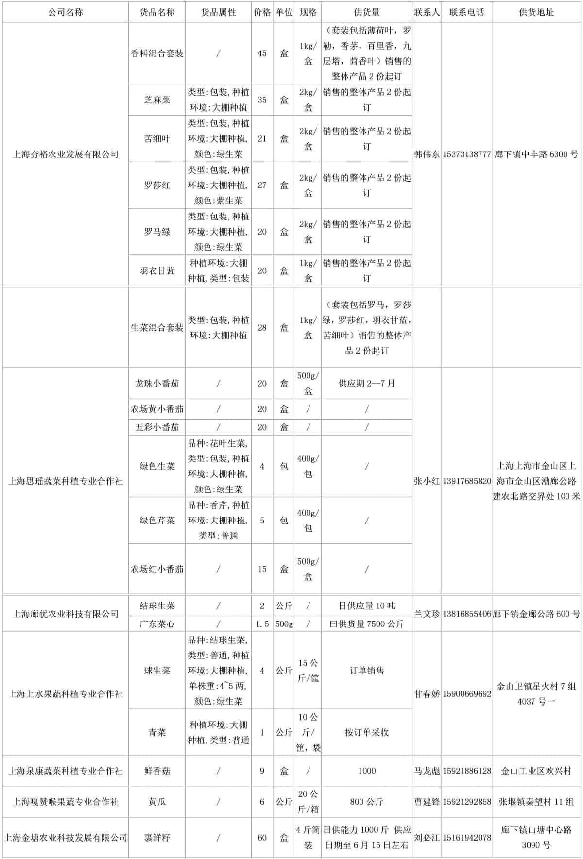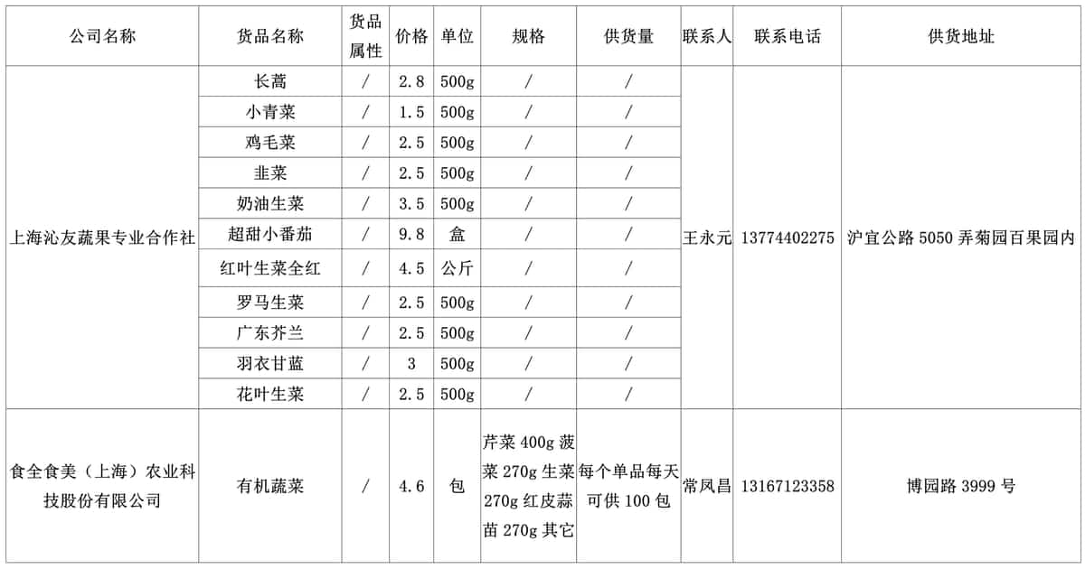 我协会根据绿色蔬菜供应信息收集小程序“申菜达”上企业自行申报的材料,收集整理了3月份—4月2日本市蔬菜品种、规格、供货量及联系方式等信息,现集中发布。同时也将在上海地产优质蔬菜线上线下融合对接平台 http://mall.guoxn.com/发布相关信息,欢迎采购。以下的价格单位为元,其他具体情况请买卖双方自行洽谈。文章源自:上海蔬菜食用菌行业协会 Shanghai Vegetable & Edible Fungi Industry Associatio上海蔬菜食用菌行业协会-https://www.shsjx.org.cn/12578.html