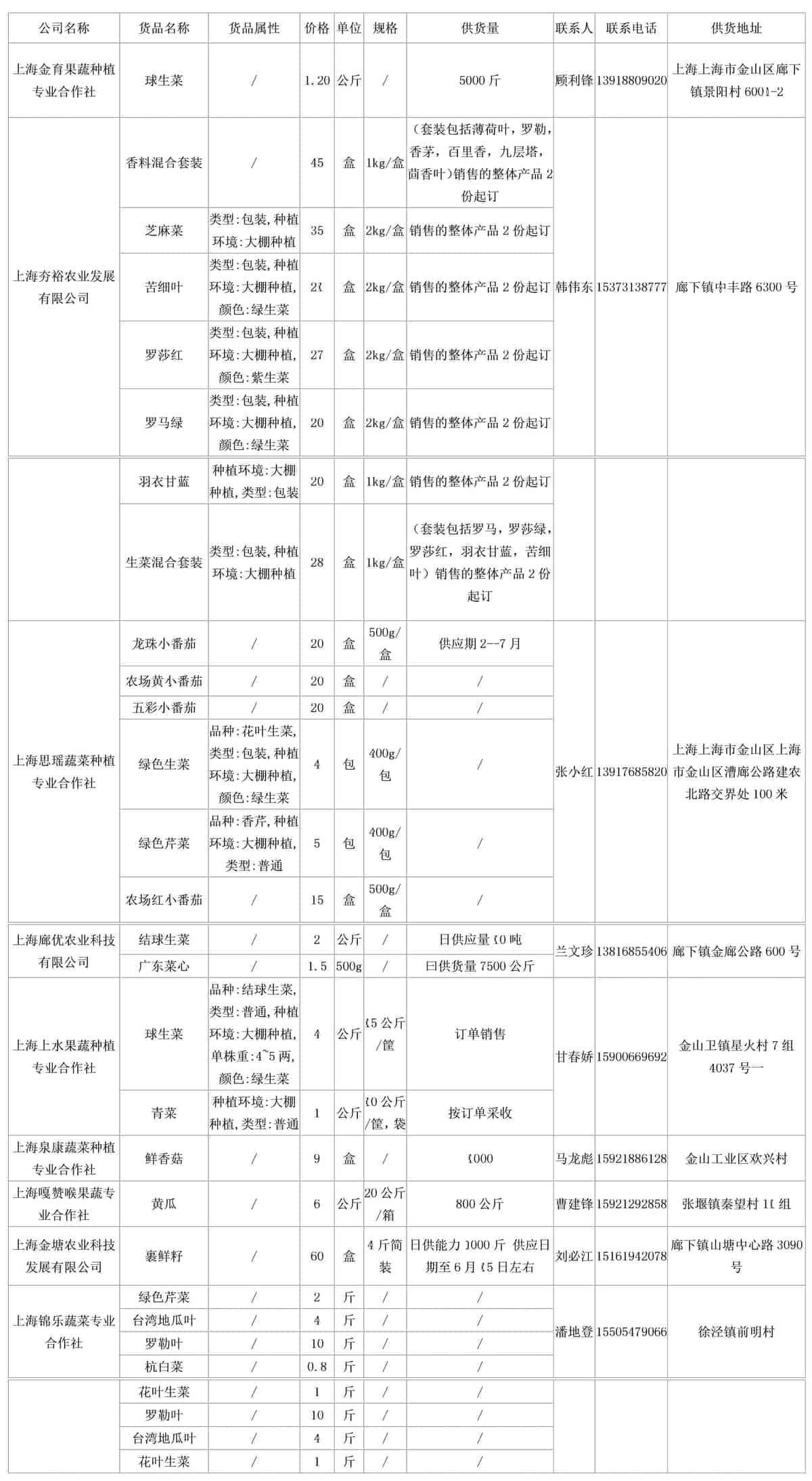 . 我协会根据绿色蔬菜供应信息收集小程序“申菜达”上企业自行申报的材料,收集整理了到4月16日为止本市蔬菜品种、规格、供货量及联系方式等信息,现集中发布。同时也将在上海地产优质蔬菜线上线下融合对接平台 (http://mall.guoxn.com/),欢迎采购。以下的价格单位为元,其他具体情况请买卖双方自行洽谈。文章源自:上海蔬菜食用菌行业协会 Shanghai Vegetable & Edible Fungi Industry Associatio上海蔬菜食用菌行业协会-https://www.shsjx.org.cn/12677.html
