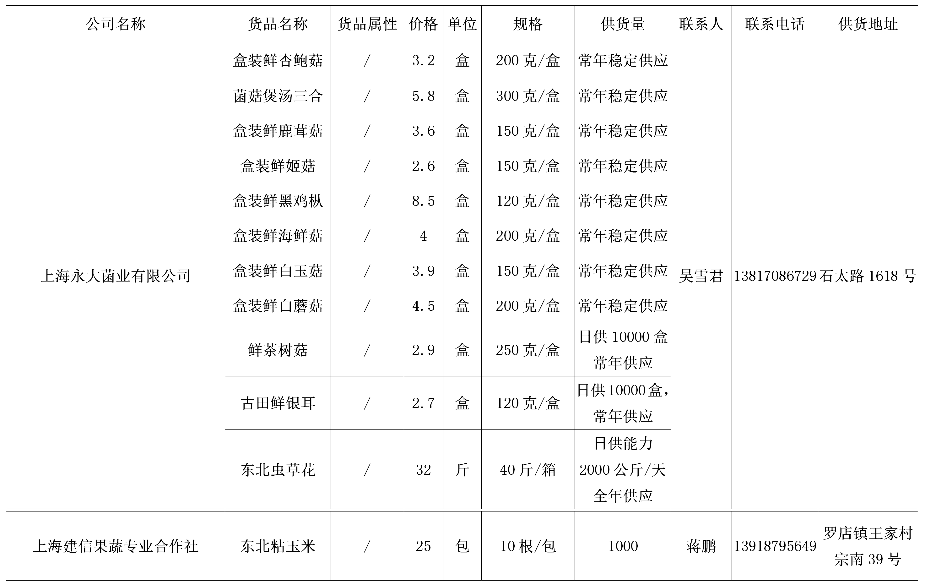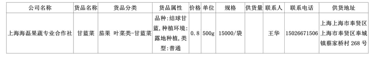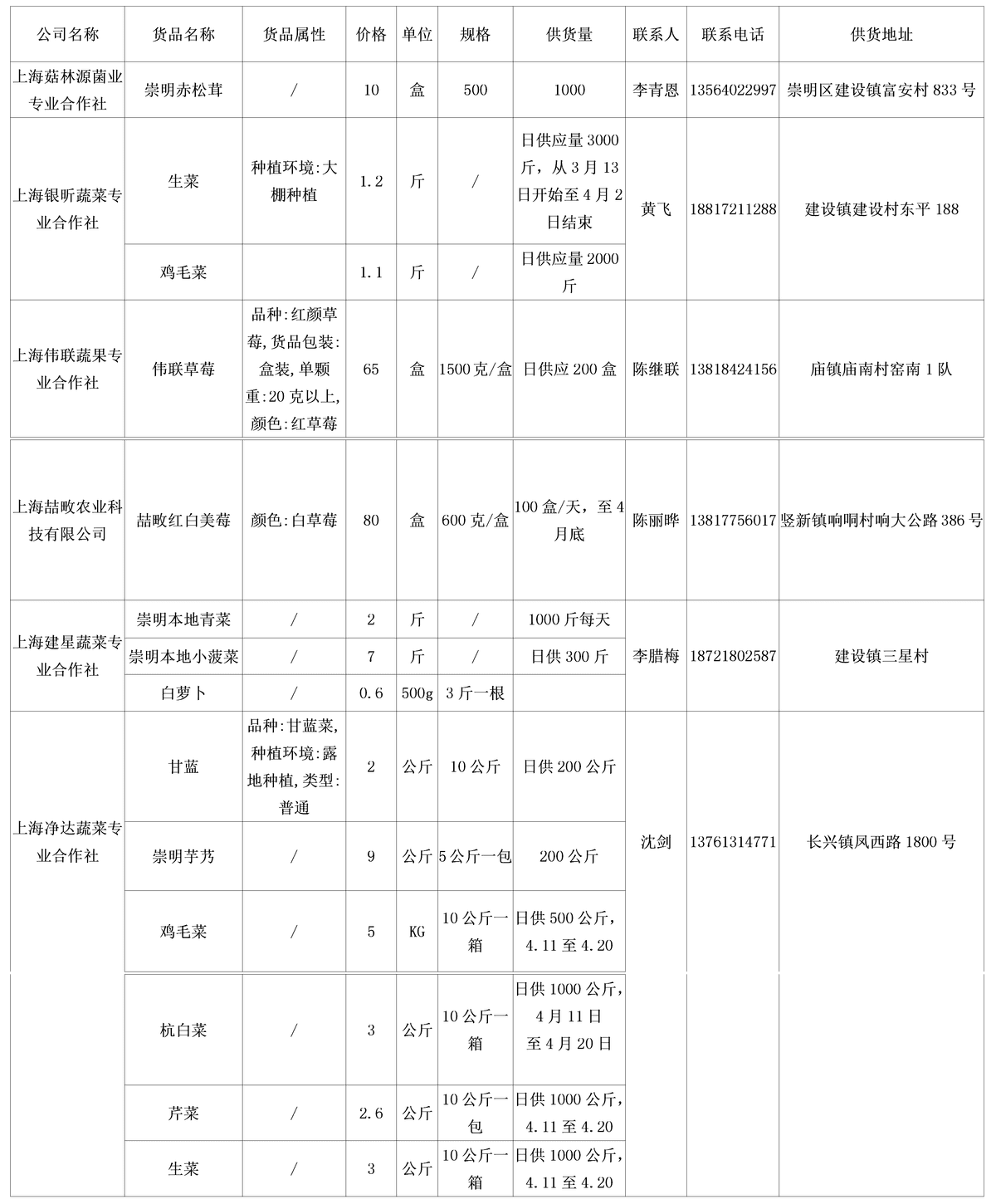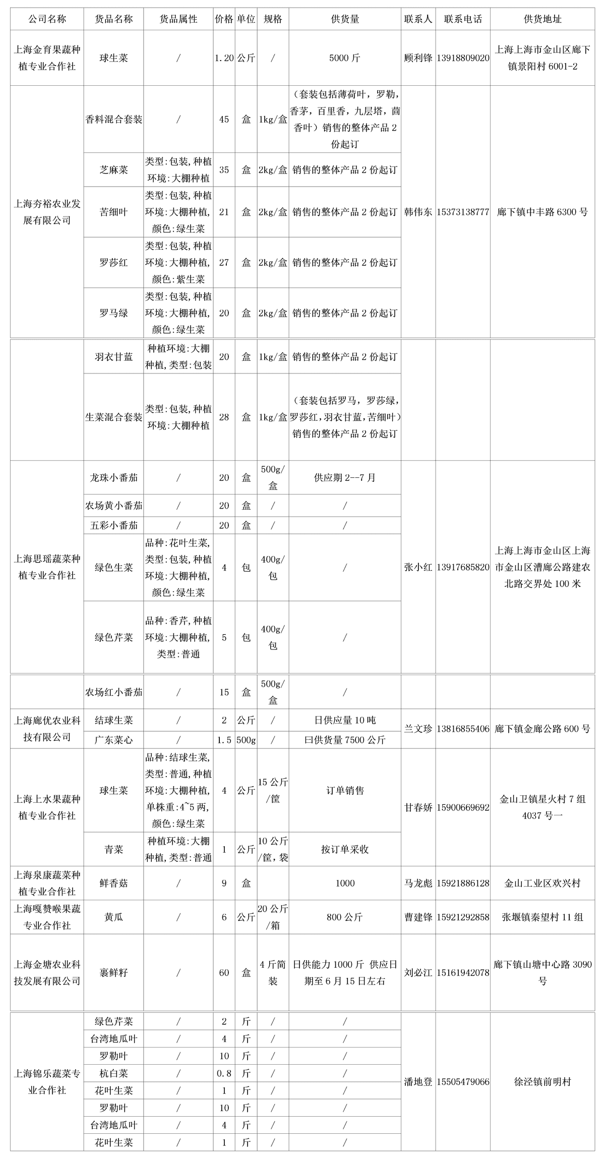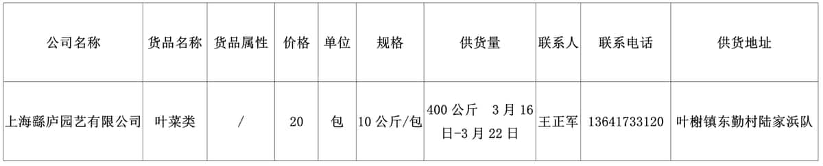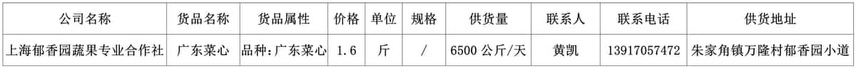 . 我协会根据绿色蔬菜供应信息收集小程序“申菜达”上企业自行申报的材料,收集整理了到4月23日为止本市蔬菜品种、规格、供货量及联系方式等信息,现集中发布。同时也将在上海地产优质蔬菜线上线下融合对接平台 http://mall.guoxn.com/,欢迎采购。以下的价格单位为元,其他具体情况请买卖双方自行洽谈。文章源自:上海蔬菜食用菌行业协会 Shanghai Vegetable & Edible Fungi Industry Associatio上海蔬菜食用菌行业协会-https://www.shsjx.org.cn/12768.html