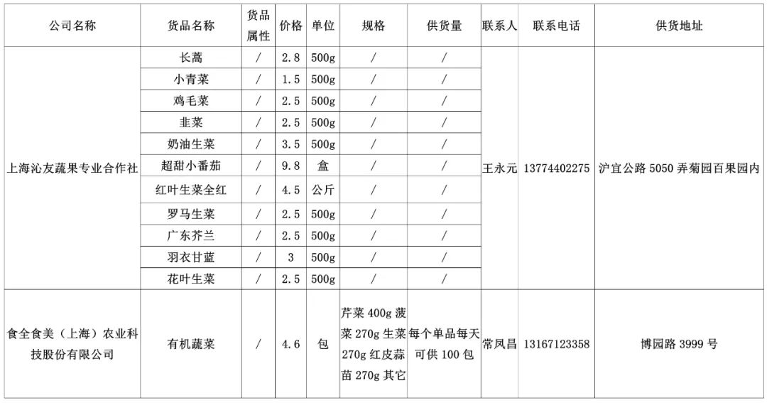 . 我协会根据绿色蔬菜供应信息收集小程序“申菜达”上企业自行申报的材料,收集整理了到5月21日为止本市蔬菜品种、规格、供货量及联系方式等信息,现集中发布。同时也将在上海地产优质蔬菜线上线下融合对接平台 http://mall.guoxn.com/,欢迎采购。以下的价格单位为元,其他具体情况请买卖双方自行洽谈。文章源自:上海蔬菜食用菌行业协会 Shanghai Vegetable & Edible Fungi Industry Associatio上海蔬菜食用菌行业协会-https://www.shsjx.org.cn/13012.html