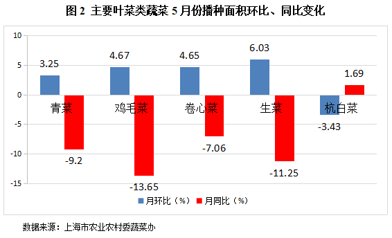 . 上海市5月气温偏高、降水分布不均、日照偏少。天气条件较适宜蔬菜生长,昼夜温差大也有利于瓜果等糖度品质的提高。5月份上海市郊区蔬菜总上市量为208698吨,环比上涨30.92%,同比下降7.37%;其中绿叶菜上市量104650吨,环比上涨11.9%,同比下降6.81%。