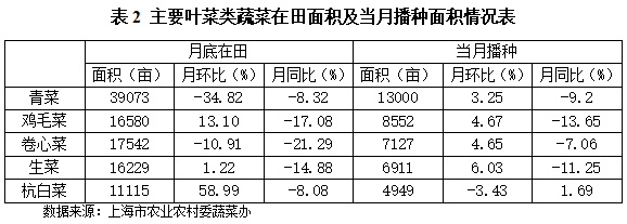 . 本月底上海市郊区蔬菜在田面积为330828亩,环比减少1.74%,同比减少15.37%。在田面积前五的蔬菜依次为:青菜(39073亩)、卷心菜(17542亩)、茭白(17208亩)、鸡毛菜(16580亩)、生菜(16229亩)。五类主要叶菜(青菜、鸡毛菜、卷心菜、生菜、杭白菜,下同)月底在田面积环比情况,鸡毛菜、生菜、杭白菜环比上涨,其中杭白菜涨幅度最大,上涨了58.99%;其他两种蔬菜在田面积环比均为减少,减幅最大的是青菜,减少了34.82%。同比情况,五种蔬菜的月底在田面积均为减少,减幅最大的是卷心菜,减少21.29%。(青菜:本文青菜指大类品种的青菜,包含青菜、五月慢等。)文章源自:上海蔬菜食用菌行业协会 Shanghai Vegetable & Edible Fungi Industry Associatio上海蔬菜食用菌行业协会-https://www.shsjx.org.cn/13206.html