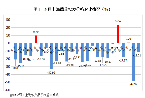 . 根据5月份全市5大批发市场监测的25种蔬菜批发价格数据,只有2种蔬菜批发价格环比上涨,涨幅最大的为圆萝卜,环比上涨23.57%;另有23种蔬菜批发价格环比下跌,跌幅最大的为蕹菜,环比下跌47.97%。