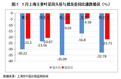 . 根据上海市农产品价格监测系统的数据采集及汇总情况来看:上海市5月蔬菜月均田头价1.92元/公斤,环比下降19.67%、同比下降16.52%;蔬菜月均批发价3.54元/公斤,环比下降16.71%、同比下降13.45%。主要的五类叶菜田头价与批发价监测数据对照情况如下:文章源自:上海蔬菜食用菌行业协会 Shanghai Vegetable & Edible Fungi Industry Associatio上海蔬菜食用菌行业协会-https://www.shsjx.org.cn/13206.html