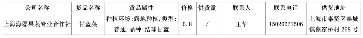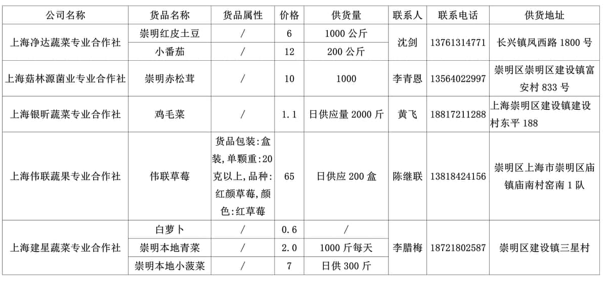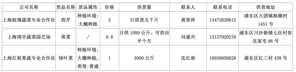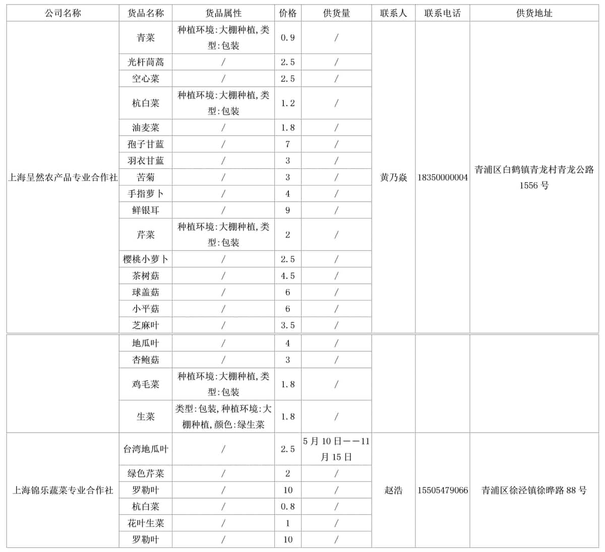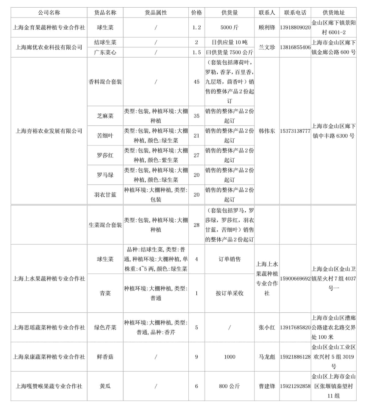 . 我协会根据绿色蔬菜供应信息收集小程序“申菜达”上企业自行申报的材料,收集整理了到7月2日为止本市蔬菜品种、规格、供货量及联系方式等信息,现集中发布。同时也将在上海地产优质蔬菜线上线下融合对接平台 http://mall.guoxn.com/,欢迎采购。以下的价格单位为元,其他具体情况请买卖双方自行洽谈。文章源自:上海蔬菜食用菌行业协会 Shanghai Vegetable & Edible Fungi Industry Associatio上海蔬菜食用菌行业协会-https://www.shsjx.org.cn/13330.html