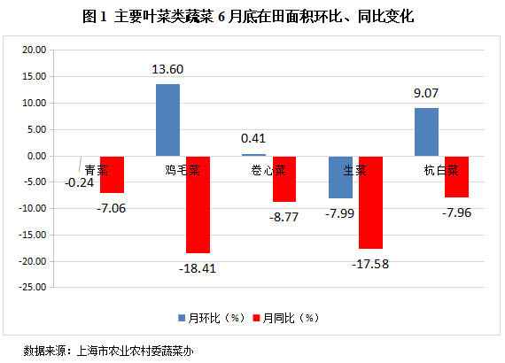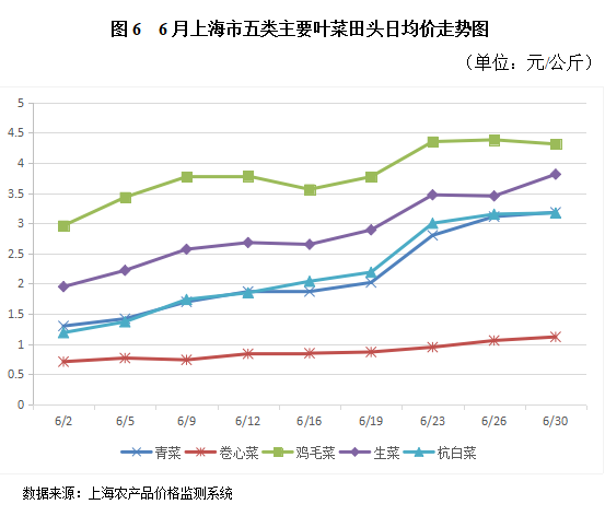 . 上海市6月平均气温偏高,降水量偏多,日照时数偏少。本月出现了4次强降水天气过程,易造成低洼田块受淹;温湿度偏高,易造成大棚作物病害发生发展。天气条件不利于蔬菜生长和管理,单产明显下降,导致绿叶菜价格持续上涨。6月份上海市郊区蔬菜总上市量为218725吨,环比上涨4.80%,同比下降7.81%;其中绿叶菜上市量96930吨,环比下降7.38%,同比下降11.86%。