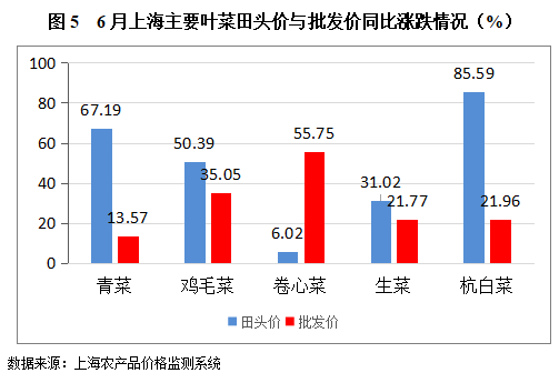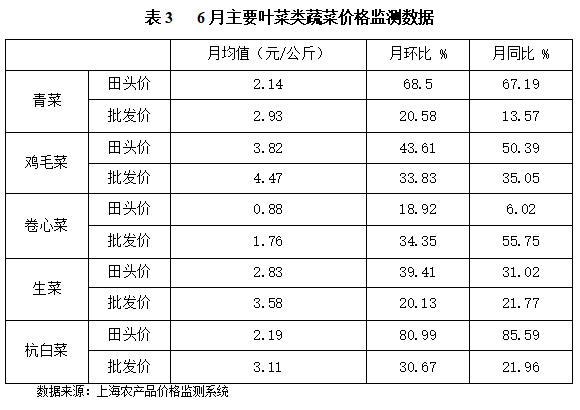 . 根据上海市农产品价格监测系统的数据采集及汇总情况来看:上海市6月蔬菜月均田头价2.64元/公斤,环比上涨37.5%、同比上涨38.95%;蔬菜月均批发价3.85元/公斤,环比上涨8.76%、同比上涨10.32%。主要的五类叶菜田头价与批发价监测数据对照情况如下:文章源自:上海蔬菜食用菌行业协会 Shanghai Vegetable & Edible Fungi Industry Associatio上海蔬菜食用菌行业协会-https://www.shsjx.org.cn/13360.html