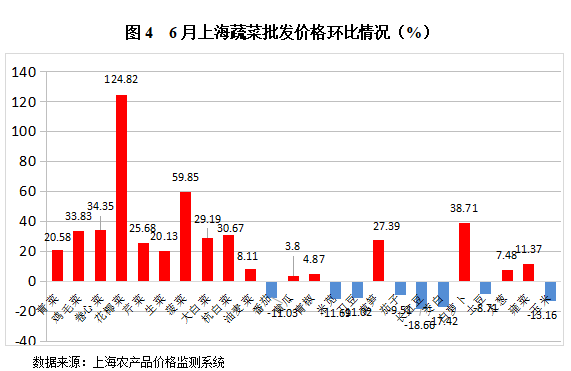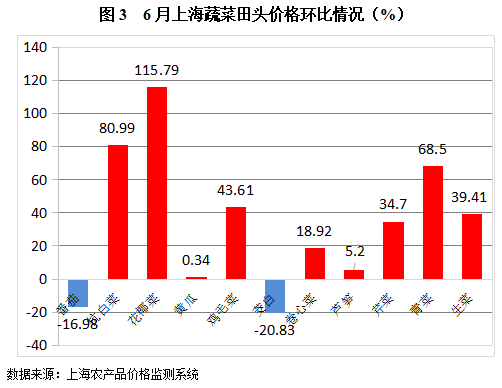 . 根据监测数据,6月份全市监测的11种蔬菜田头价环比中只有番茄和茭白是下降的,下跌幅度最大的是茭白,下降了20.83%;其他9种蔬菜的田头价环比均为上涨,花椰菜上涨幅度最大,为115.79%。文章源自:上海蔬菜食用菌行业协会 Shanghai Vegetable & Edible Fungi Industry Associatio上海蔬菜食用菌行业协会-https://www.shsjx.org.cn/13360.html