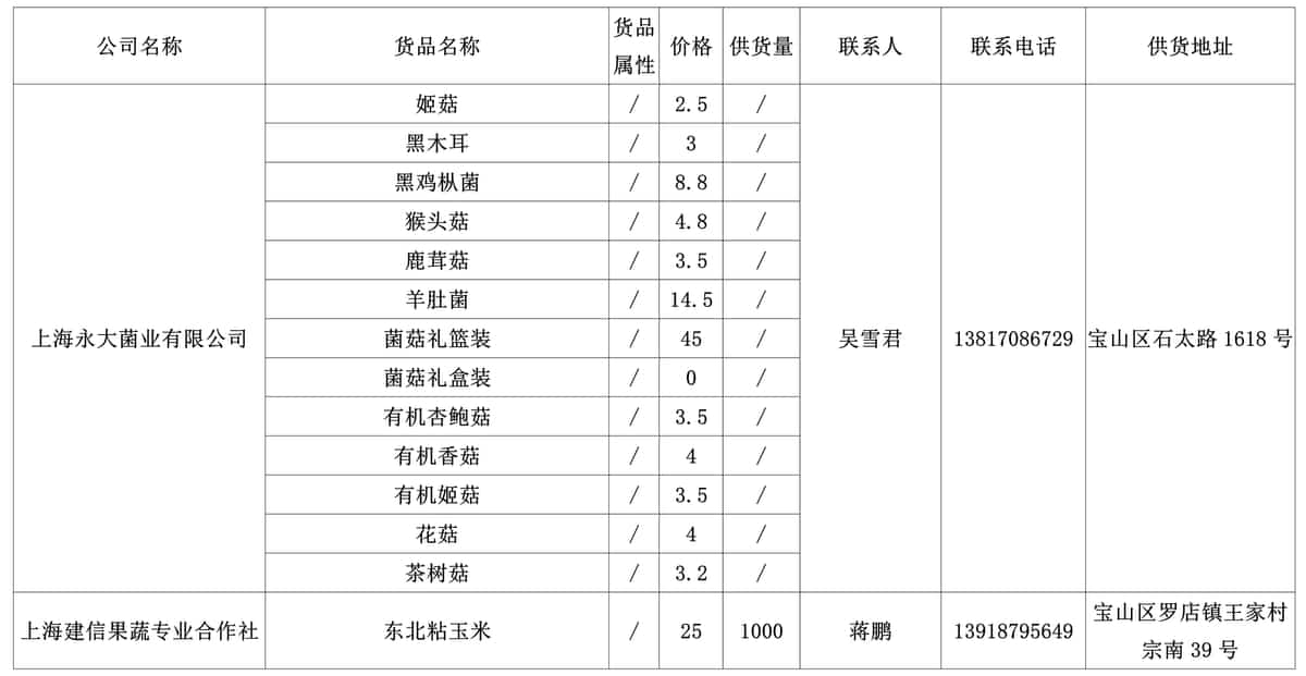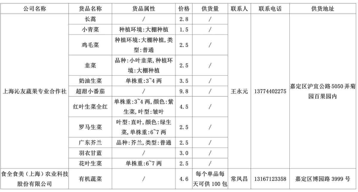 . 我协会根据绿色蔬菜供应信息收集小程序“申菜达”上企业自行申报的材料,收集整理了到7月9日为止本市蔬菜品种、规格、供货量及联系方式等信息,现集中发布。同时也将在上海地产优质蔬菜线上线下融合对接平台 http://mall.guoxn.com/,欢迎采购。以下的价格单位为元,其他具体情况请买卖双方自行洽谈。文章源自:上海蔬菜食用菌行业协会 Shanghai Vegetable & Edible Fungi Industry Associatio上海蔬菜食用菌行业协会-https://www.shsjx.org.cn/13380.html