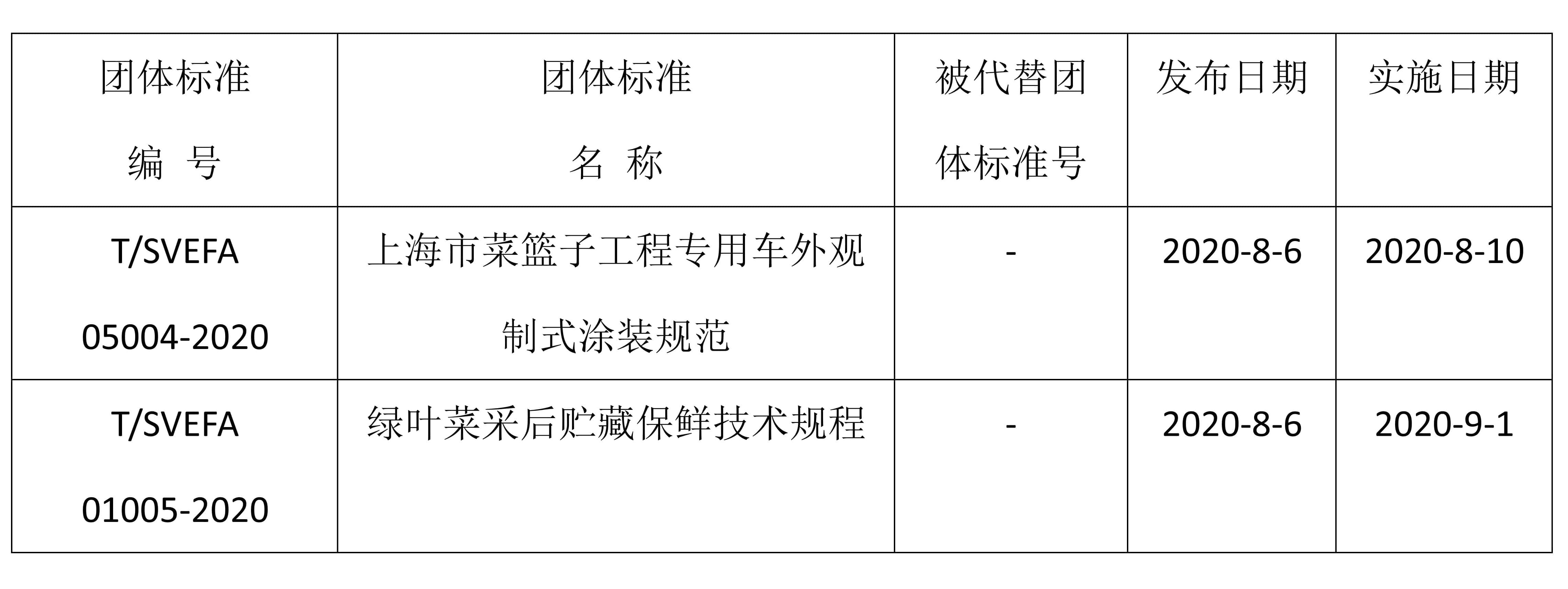 《上海市菜篮子工程专用车外观制式涂装规范》和《绿叶菜采后贮藏保鲜技术规程》2项团体标准已经过提案、立项、起草、征求意见、技术审查,符合团体标准制修订要求。现予以发布。