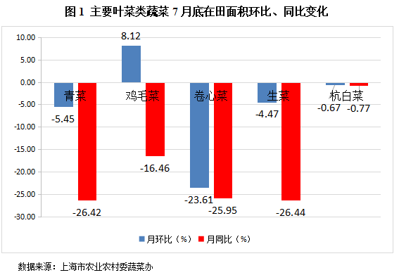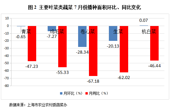 . 上海市7月平均气温比常年偏低,降水量较常年偏多,日照时数较常年偏少。今年梅雨期较长(7月 21日出梅),上、中旬气温低、降水量多、日照时数少,天气条件对露地蔬菜生长及大棚作物生长、管理不利;下旬出梅后气温升高,日照时数也有所增加,天气条件对作物苗期有所改善。7月份上海市郊区蔬菜总上市量为174881吨,环比下降20.23%,同比下降10.24%;其中绿叶菜上市量92285吨,环比下降4.79%,同比下降14.21%。