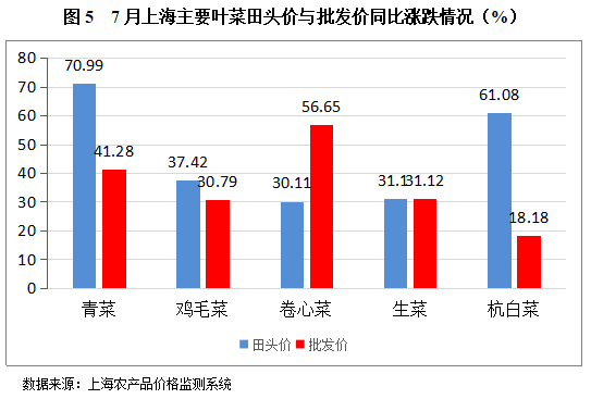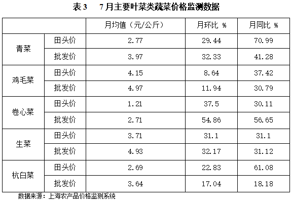 . 根据上海市农产品价格监测系统的数据采集及汇总情况来看:上海市7月蔬菜月均田头价3.15元/公斤,环比上涨19.32%、同比上涨40%;蔬菜月均批发价4.53元/公斤,环比上涨17.66%、同比上涨20.48%。主要的五类叶菜田头价与批发价监测数据对照情况如下:文章源自:上海蔬菜食用菌行业协会 Shanghai Vegetable & Edible Fungi Industry Associatio上海蔬菜食用菌行业协会-https://www.shsjx.org.cn/13616.html