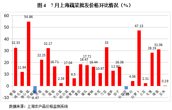. 根据7月份全市5大批发市场监测的24种蔬菜批发价格数据,只有花椰菜和长豇豆这2中蔬菜批发价格环比下跌,跌幅最大的为花椰菜,环比下跌6.47%;另有22种蔬菜批发价格环比上涨,涨幅最大的为卷心菜,环比上涨了54.86%。