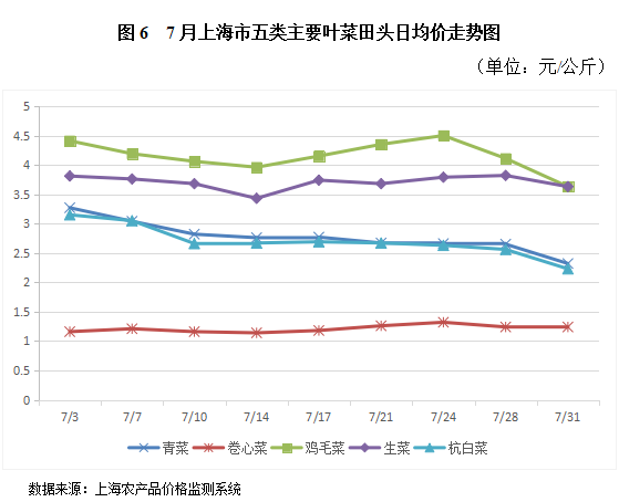 . 纵观五种主要叶菜7月份田头价格,从月初至月末波动不大,7月初延续6月末的价格高位,之后五种蔬菜价格缓慢下降,至月中时鸡毛菜和生菜略有反弹,月末基本呈下降趋势。整个7月份,同一种品类的蔬菜其全月日均最高价与最低价之间最大相差0.95元。