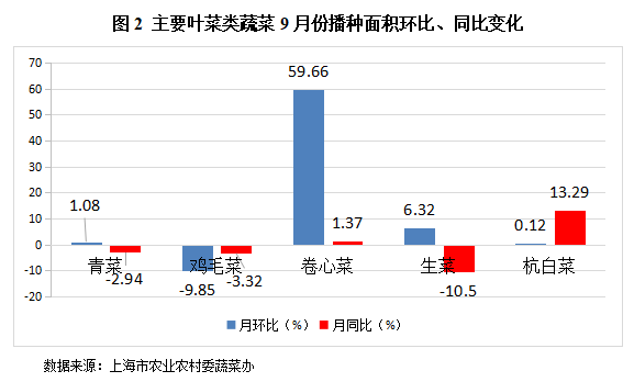 . 上海市9月平均气温略高于常年,降水量明显偏多,日照时数偏少。天气条件基本适宜在田蔬菜生长、管理,但中旬的明显降水对地产绿叶菜生长有所影响。9月份上海市郊区蔬菜总上市量为187953吨,环比上涨17.78%,同比下降4.38%;其中绿叶菜上市量93742吨,环比上涨6.85%,同比下降14.02%。
