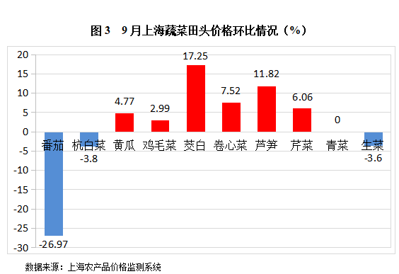 . 根据监测数据,9月份全市监测的10种蔬菜田头价环比有6种蔬菜上涨,涨幅最大的是茭白,上涨了17.25%;有3种蔬菜环比下跌,跌幅最大的为番茄,下跌了26.97%;青菜田头价环比与上月持平。文章源自:上海蔬菜食用菌行业协会 Shanghai Vegetable & Edible Fungi Industry Associatio上海蔬菜食用菌行业协会-https://www.shsjx.org.cn/13974.html