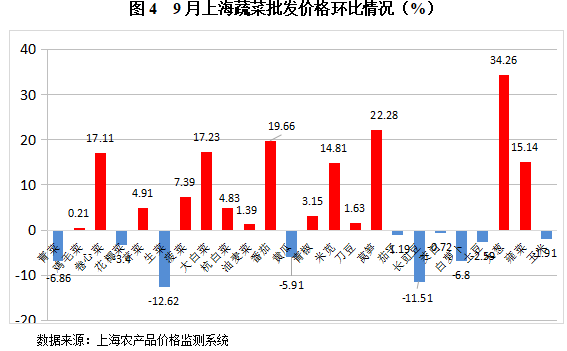 . 根据9月份全市5大批发市场监测的24种蔬菜批发价格数据,环比上涨的有14种蔬菜,涨幅最大的为大葱,上涨34.26%;另有10种蔬菜批发价格环比下降,跌幅最大的为生菜,环比下降了12.62%。