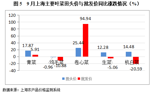 . 根据上海市农产品价格监测系统的数据采集及汇总情况来看:上海市9月蔬菜月均田头价3.14元/公斤,环比上涨0.64%、同比上涨6.8%;蔬菜月均批发价4.93元/公斤,环比上涨3.35%、同比上涨12.3%。主要的五类叶菜田头价与批发价监测数据对照情况如下:文章源自:上海蔬菜食用菌行业协会 Shanghai Vegetable & Edible Fungi Industry Associatio上海蔬菜食用菌行业协会-https://www.shsjx.org.cn/13974.html