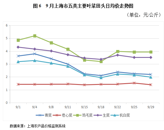 . 纵观五种主要叶菜9月份田头价格,除卷心菜田头价格整体稳定,波动不大外,其他4种蔬菜从月初延续了8月底菜价的高位,至中下旬时为最低,9月22日后略有回升,至月末走势平缓,波动不大。整个9月份,同一种品类的蔬菜其全月日均最高价与最低价之间最大相差1.69元。