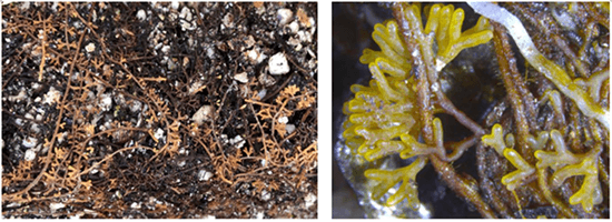 松乳菇菌根形态特征(左,肉眼观察;右,解剖镜下观察)