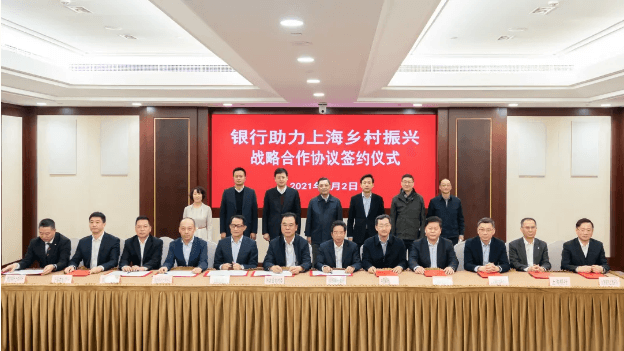 . 为深入贯彻习近平新时代中国特色社会主义思想和党的十九大关于实施乡村振兴战略的重大决策部署,进一步提升农业农村金融服务水平,全面支持上海乡村振兴“三园”(美丽家园、绿色田园、幸福乐园)工程建设,2021年2月2日,上海市农业农村委员会与中国农业发展银行上海市分行、中国工商银行股份有限公司上海市分行、中国农业银行股份有限公司上海市分行、中国银行股份有限公司上海市分行、中国建设银行股份有限公司上海市分行、交通银行股份有限公司上海市分行、中国邮政储蓄银行股份有限公司上海市分行、上海浦东发展银行股份有限公司上海分行、上海银行股份有限公司、上海农村商业银行股份有限公司、北京银行股份有限公司上海分行等11家银行签订战略合作协议,共同推进乡村振兴重点领域发展。相关市领导出席签约仪式。市农业农村委主任张国坤代表市农业农村委与11家银行代表现场签约。