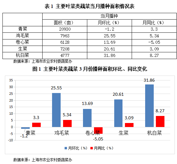 . 上海3月全市平均气温偏高、降水量偏少但雨日略多、日照时数偏少。上旬以阴雨天气为主,中旬有3次较明显降水过程,多阴雨、少日照不利于蔬菜生长。下旬多晴好天气,降水偏少,日照丰富,有利于作物生长。3月份上海市郊区蔬菜总上市量为158239吨,环比增加14.26%,同比增加5.25%;其中绿叶菜上市量105350吨,环比增加20.39%,同比增加11.48%。