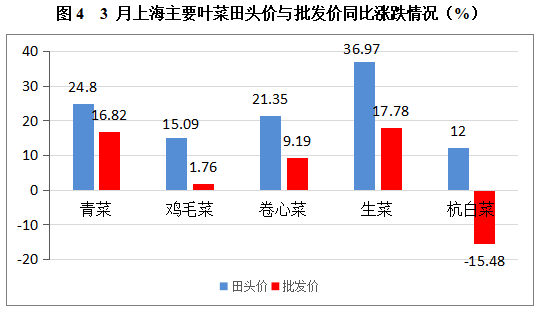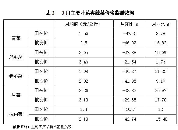 . 根据上海市农产品价格监测系统的数据采集及汇总情况来看:上海市3月蔬菜月均田头价2.12元/公斤,环比下降33.96%、同比上涨18.44%;蔬菜月均批发价4.86元/公斤,环比下降11.31%、同比上涨9.46%。主要的五类叶菜田头价与批发价监测数据对照情况如下:文章源自:上海蔬菜食用菌行业协会 Shanghai Vegetable & Edible Fungi Industry Associatio上海蔬菜食用菌行业协会-https://www.shsjx.org.cn/15147.html