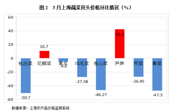 . 根据监测数据,3月份全市监测的8种蔬菜田头价环比,有2种蔬菜为增加,增幅最大的为芦笋,增加了42.2%;另6种蔬菜环比均为下降,降幅最大的为杭白菜,下降了50.7%。文章源自:上海蔬菜食用菌行业协会 Shanghai Vegetable & Edible Fungi Industry Associatio上海蔬菜食用菌行业协会-https://www.shsjx.org.cn/15147.html