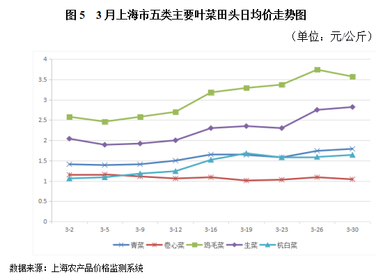 . 3月份五种主要叶菜田头价格整体呈略微上升走势。5种蔬菜价格在上旬时有较为稳定,鸡毛菜和生菜在中旬开始有略微上涨,其他3种蔬菜价格全月较为稳定。整个3月份,同一种品类的蔬菜其全月日均最高价与最低价之间最大相差1.28元。