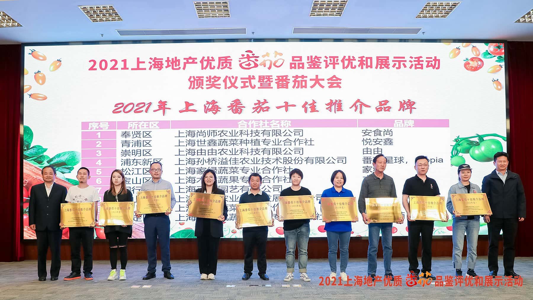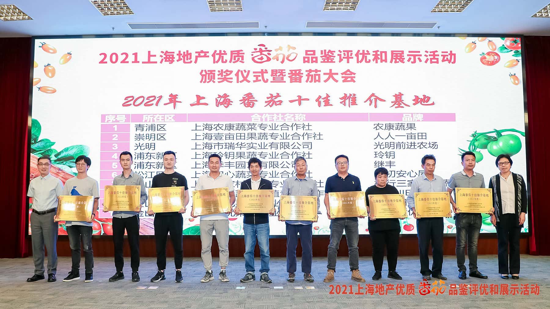 . 在这次番茄大会上,我协会还与上海蔬菜经济研究会、安信农业保险股份有限公司三家单位联合发布了“上海番茄十佳推介基地”“上海番茄十佳推介品牌”及“2021年上海首届番茄大会优秀展示奖”。文章源自:上海蔬菜食用菌行业协会 Shanghai Vegetable & Edible Fungi Industry Associatio上海蔬菜食用菌行业协会-https://www.shsjx.org.cn/15332.html